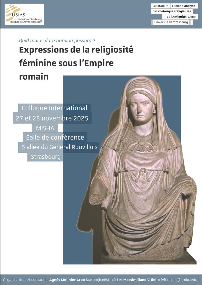 Colloque international : Expressions de la religiosité féminine sous l’Empire romain 27 novembre 2025 Quid maius dare numina possunt ? Colloque international 27 & 28 novembre 2025 MISHA, salle de conférence Fichier(s) lié(s) Nom du fichier : programme_colloque_USIAS.pdf Extension du fichier : pdf Poids du fichier : 296 Ko